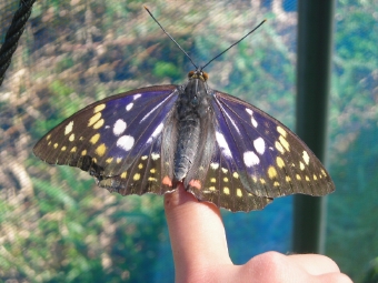「つくば環境フォーラム」では、平成15年12月より、地主さんの了解を得て、つくば市下平塚の保健保安林に指定された雑木林をモデル地区として、オオムラサキが棲める里山の環境づくりに取り組んでいます。つくばエクスプレス「研究学園駅」のすぐ近く、つくば市の中心部にあって、まとまった緑が残されている貴重な場所です。松枯れ後の林にドングリから苗をつくったコナラ、クヌギを植え、林縁にはオオムラサキの幼虫の植樹であるエノキを植えました。森づくりボランティアで下草刈りを行って、今では雑木林が再生しています。森づくりと並行して、周辺の開発予定地にいたオオムラサキをレスキューしての保護飼育を10年続け、この雑木林に順次戻し、オオムラサキの「新たなふるさとづくり」をしました。うれしいことに、最近では、その成果が現れて、毎年、蝶を観察し、越冬する幼虫も増えています。