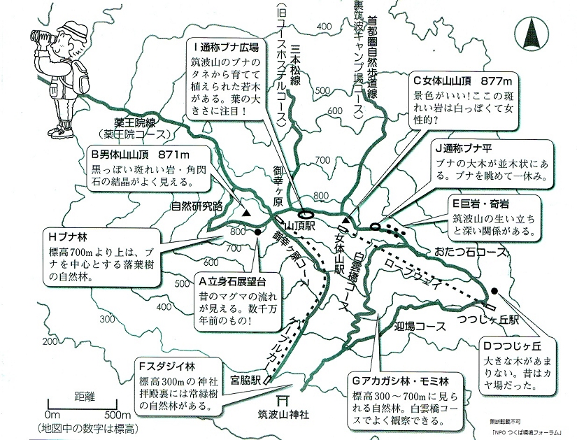一般に、標高が100m高くなると気温は0.6℃下がるといわれています。筑波山の山頂付近ではふもとより5℃ほど気温が低くなります。筑波山の南面は筑波山神社の境内林として保護されてきたので、自然の森林がよく残されており、気温の変化によって自然林が変化する様子が観察できます。標高300mの筑波山神社拝殿付近では暖かい地域に生育する常緑のスダジイ林がみられます(F)。登山道を登るとアカガシやモミの林になります(G)。標高700mくらいから上は落葉のブナ林に変わります(H)。白雲橋コースを歩くと、その変化がよくわかります。スギの大木も見られますが、これは古くに植えられたもので、また、山裾にはかつて薪炭林として利用されていたコナラなどの雑木林やアカマツ林があります。  (右図をクリックすると拡大表示されます→)